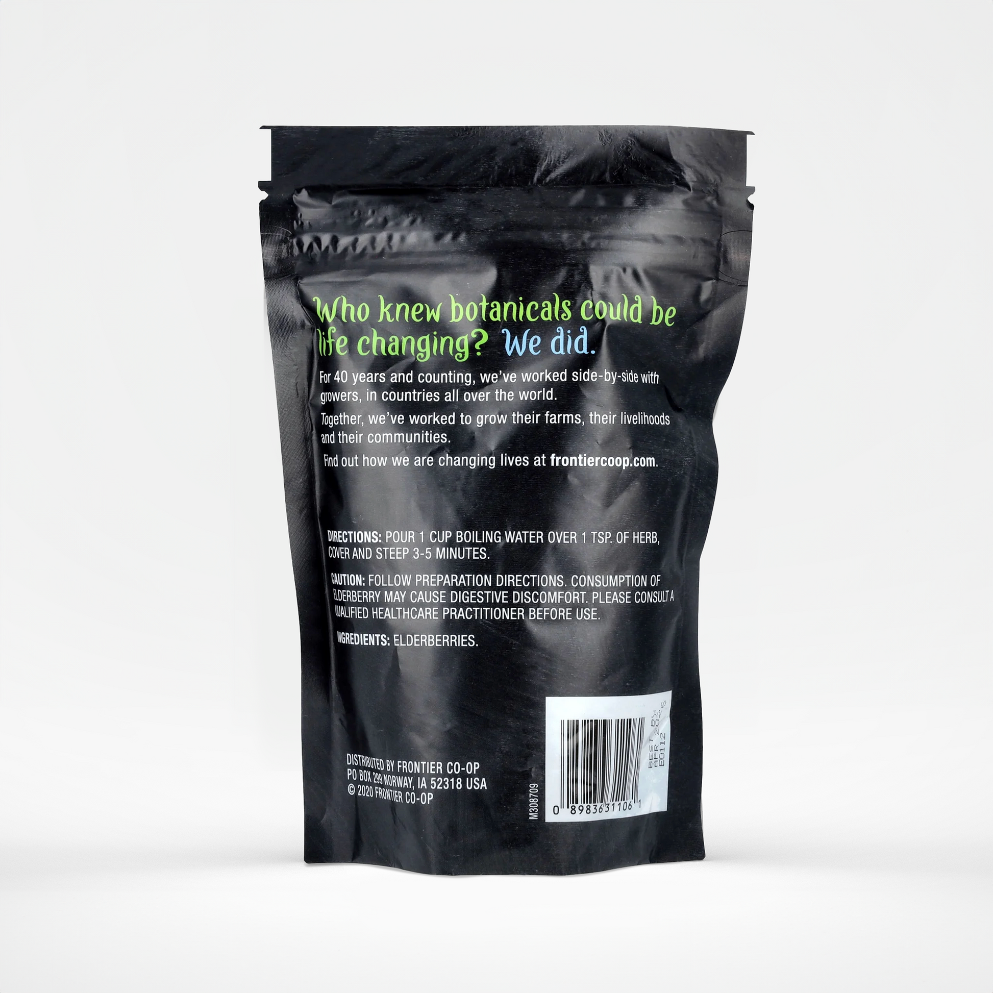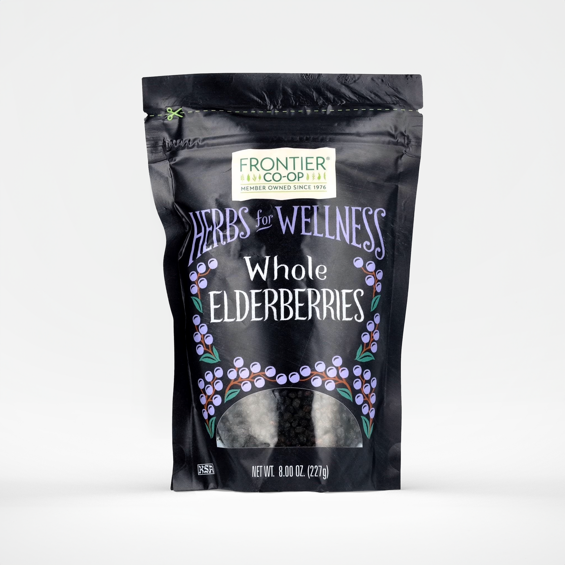 Frontier Co-op® Organic Elderberries (Sambucus nigra) are attractive dark purple berries grown in their native Bulgaria. These appealing dark berries are part of the honeysuckle family and are commonly used as a wellness tea or as an ingredient in culinary dishes.