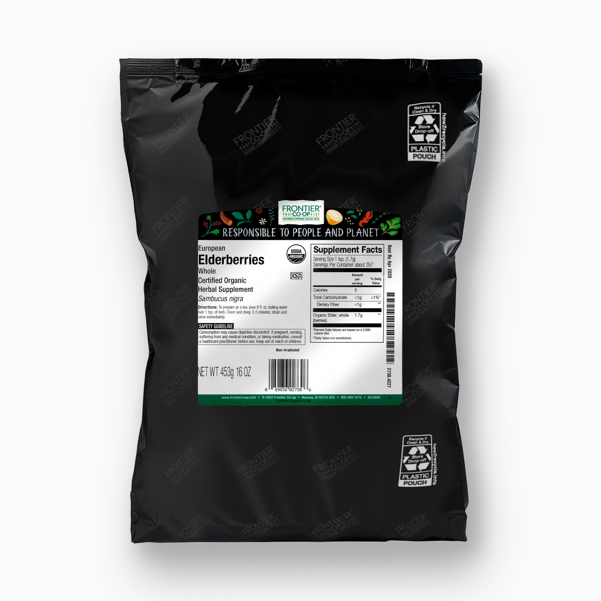 Frontier Co-op® Organic Elderberries (Sambucus nigra) are attractive dark purple berries grown in their native Bulgaria. These appealing dark berries are part of the honeysuckle family and are commonly used as a wellness tea or as an ingredient in culinary dishes.