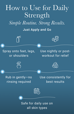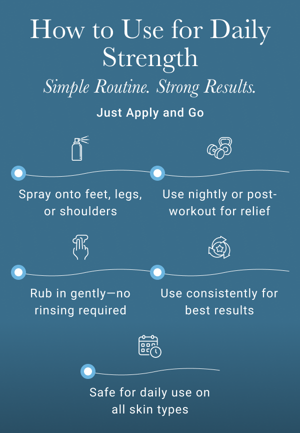 Spray directly onto areas experiencing muscle tension or soreness, such as legs, arms, or abdomen.Gently massage the spray into the skin until fully absorbed.