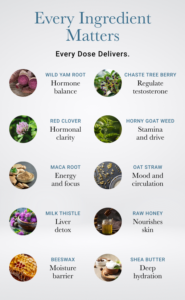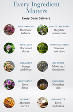 Wild Yam Root, Red Clover, Chaste Tree Berry, Horny Goat Weed, Oat Straw, Milk Thistle, Maca Root, Organic Shea Butter, Organic Beeswax, Raw Honey, Frankincense Essential Oil