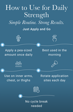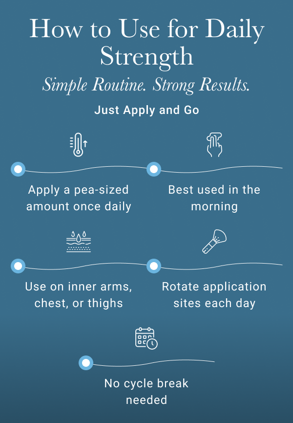 Just apply a small amount of Solomon's Secret cream to clean, dry skin once a day. Rub it in on your chest, inner arms, or thighs until it’s fully absorbed. Stick with it daily to see the best results.