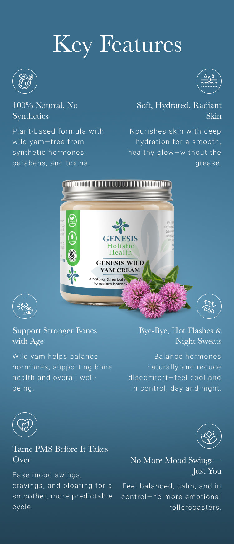 Some women use Genesis Wild Yam Cream to help manage PMS symptoms, including mood swings, breast tenderness, heavy/painful periods, and bloating. Wild yam cream may help balance hormones naturally.